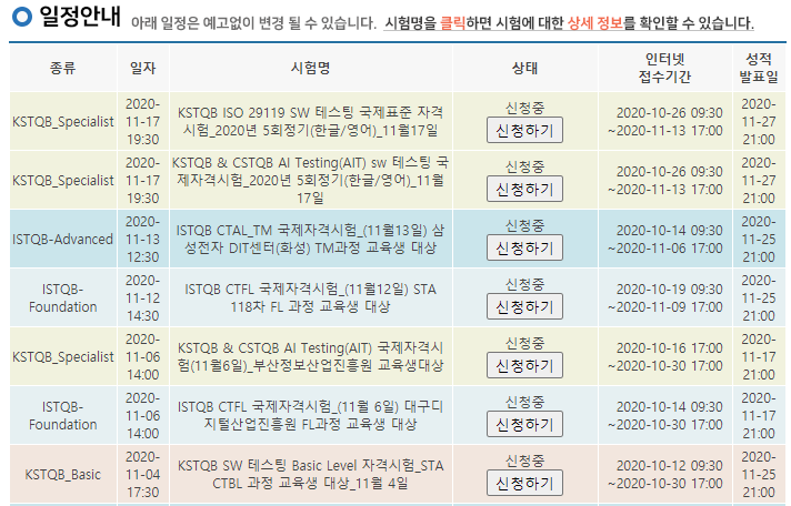 아래는 직접 찾아본 Testing 시험 일정이다. 수업 듣는 김에 시험도 보면 좋을텐데, 시험 일정도 마땅치가 않다.