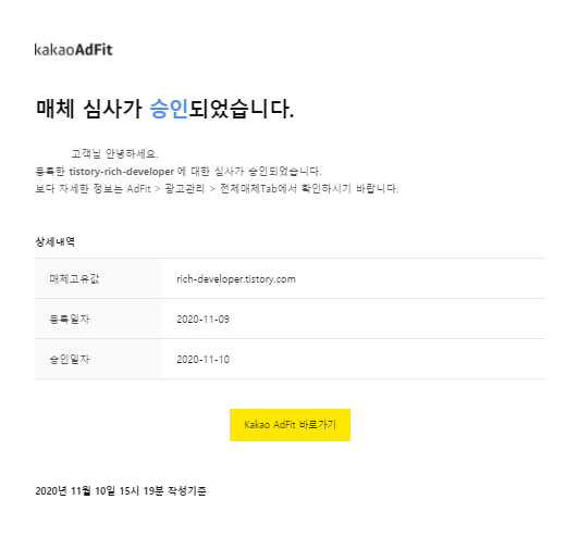 # 티스토리에 수익 파트가 생겼길래 신청했더니, 바로 다음날 승인되었다는 메일이 옵니다.