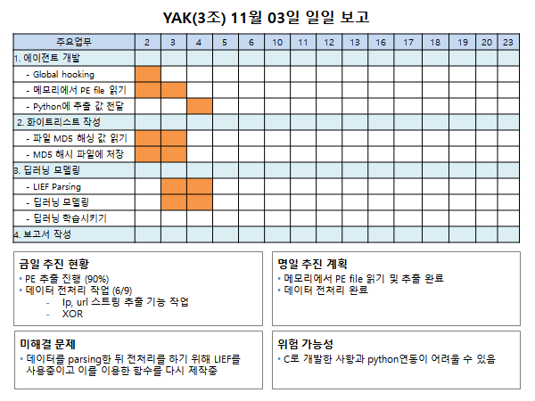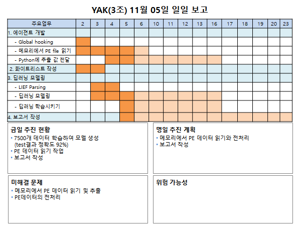 11월 2일에, 착수보고서와 일일보고서를 작성했다. 둘 다 초본은 내가 작성하고, 다른 팀원들은 계속 개발을 했다.