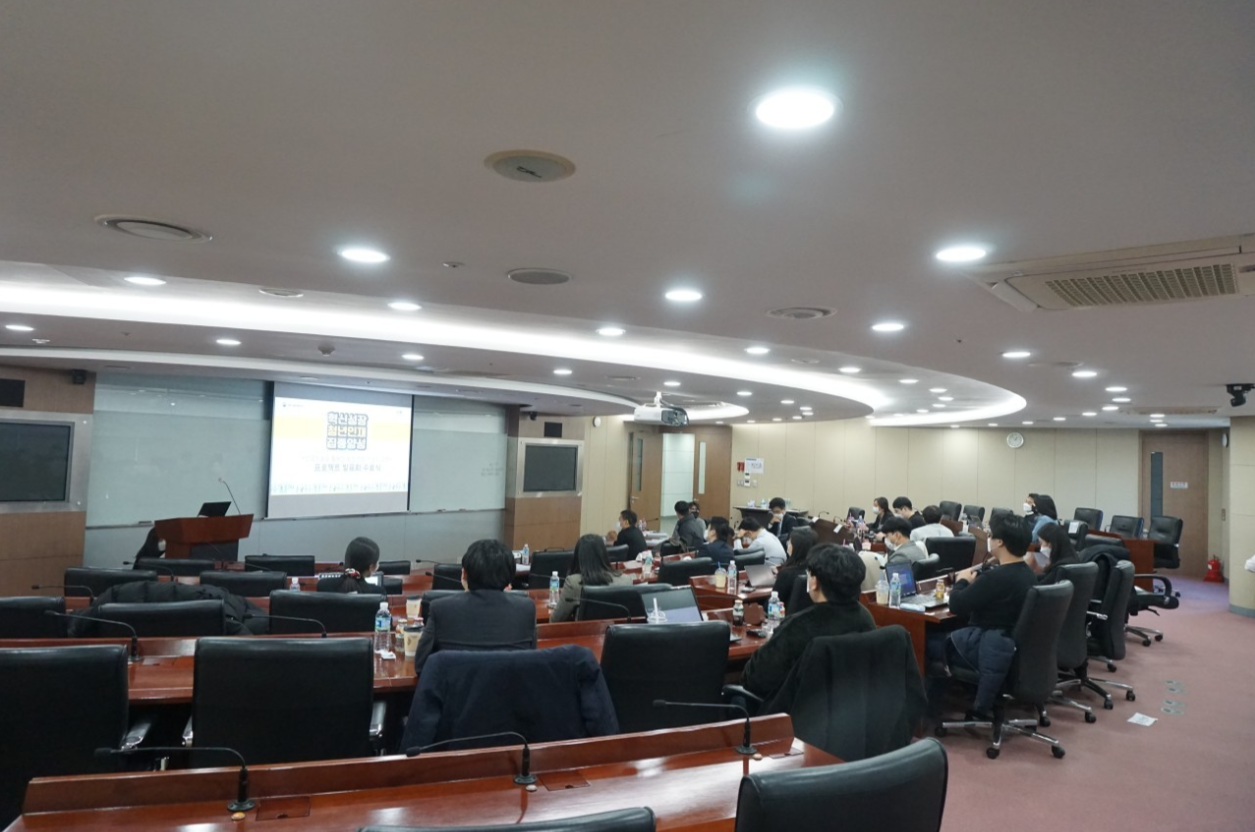 오늘 최종 프로젝트 발표 후에 수료식이 있다. 거리두기 지켜서 넓직넓직하게 사람들이 자리에 앉아있는 모습이다. 최종 발표 심사를 위해 외부 심사위원님들도 오셨다.