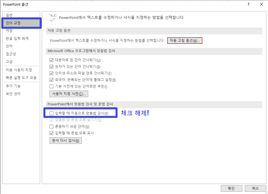 좌측 상단 파일 > 좌측 하단 옵션 누르시면 언어교정 란이 있습니다.