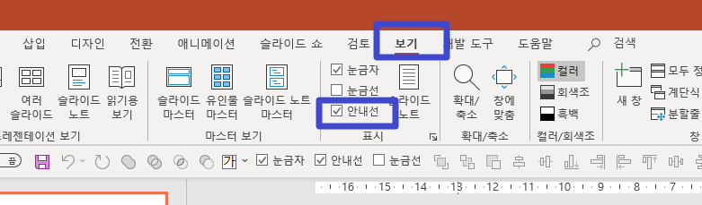 안내선은 상단 리본메뉴에서 보기 > 안내선 체크해서 사용할 수 있습니다.
