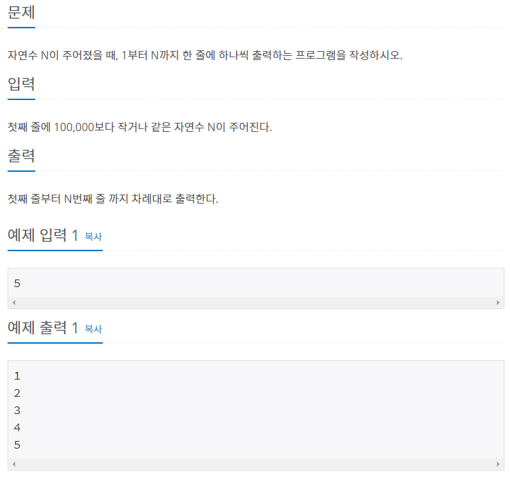 자연수 N이 주어졌을 때, 1부터 N까지 한 줄에 하나씩 출력하는 프로그램을 작성하시오.