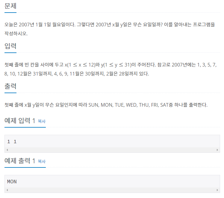 첫째 줄에 빈 칸을 사이에 두고 x(1 ≤ x ≤ 12)와 y(1 ≤ y ≤ 31)이 주어진다. 참고로 2007년에는 1, 3, 5, 7, 8, 10, 12월은 31일까지, 4, 6, 9, 11월은 30일까지, 2월은 28일까지 있다.
