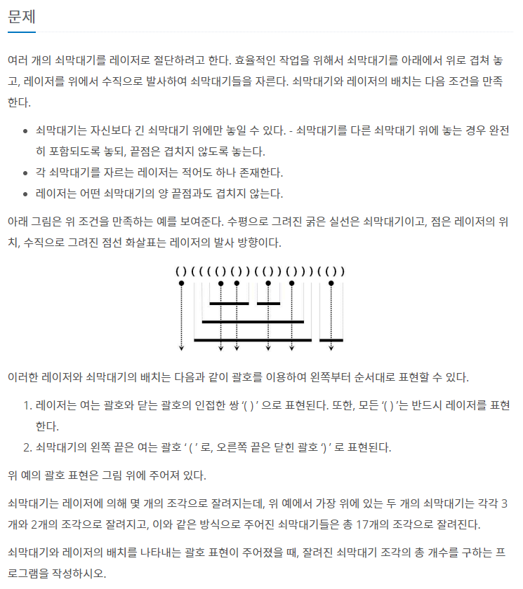 '(' 가 나오면 막대기 레이어가 추가되고, ')'가 나오면 레이어가 준다. '()' 가 나오면 레이어 수만큼 절단된 쇠막대기 개수가 증가한다.