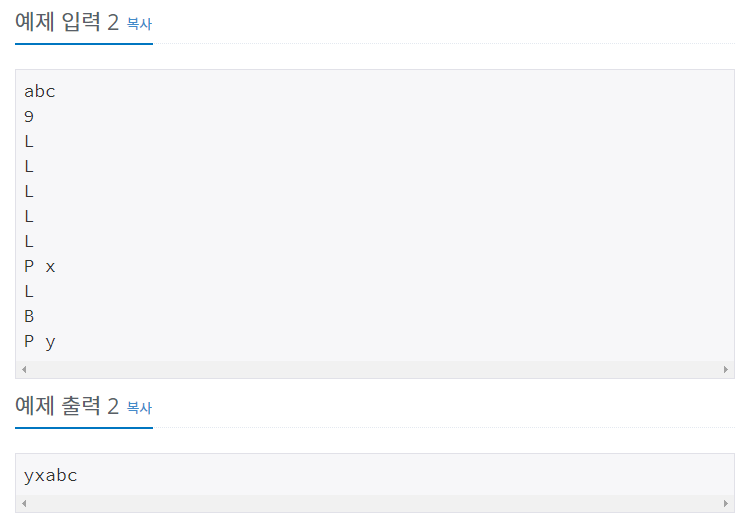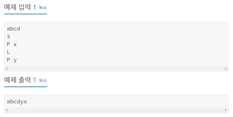 첫째 줄에는 초기에 편집기에 입력되어 있는 문자열이 주어진다. 이 문자열은 길이가 N이고, 영어 소문자로만 이루어져 있으며, 길이는 100,000을 넘지 않는다. 둘째 줄에는 입력할 명령어의 개수