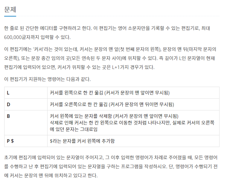 ✅ 커서의 왼쪽에 들어가는 문자들과, 커서의 오른쪽에 들어가는 문자들을 따로 보관하였다. 커서가 움직일 때마다 왼쪽과 오른쪽 문자가 들어있는 배열에 push 하고 pop 하여 구현하였다. R의 최대는 600000 이고, L은 커서를 왼쪽으로 옮길 때 입력이 되기 때문에 (문자 입력+L 동작이 필요) 300000을 최대로 잡았다. C언어로 풀었는데, 아마 C++ 이나 파이썬에서는 stack 을 활용해서 더 쉽게 구현할 수 있을 것 같다.
