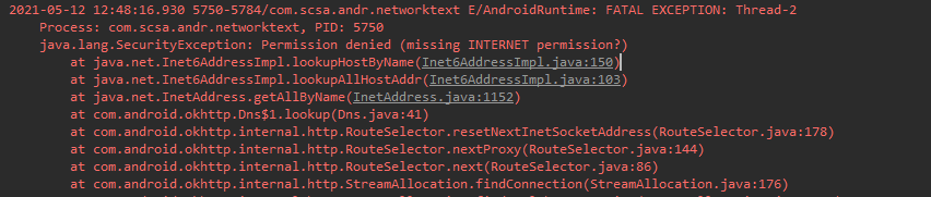 java.lang.SecurityException: Permissiondenied (missing INTERNET permission?) 이라 써있다.