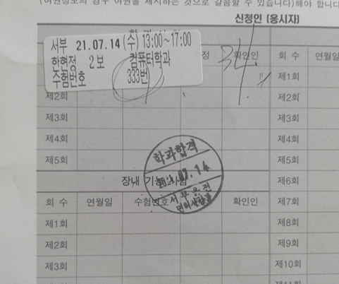 - 3층 가서 번호표 뽑고, 순서되면 들어가셔서 안내대로 시험보시면 됩니다. 저는 34번 자리에서 수험번호 333번을 받았습니다. (이게 왜 기억이 나는거지...;;) 핸드폰 끄고, 자리에 가면 시험을 볼 수 있어요. 시험을 다 보면 시험 종료를 누르는데, 바로 시험 점수와 결과를 확인할 수 있습니다! 저는 78점으로 한 번에 합격했어요~ 앞에 안내해주시는 분들께 가면 접수증에 합격도장 찍어주십니다!