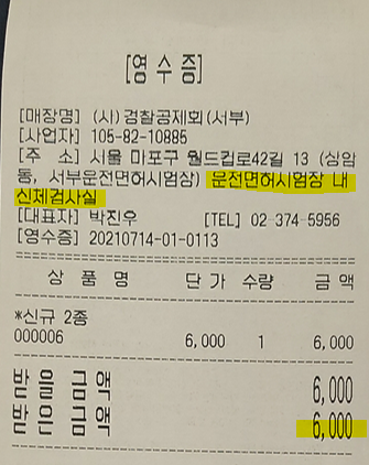 - 오른쪽 앞쪽으로 가면 신체검사하는 공간이 있어요. 아까 작성한 종이 가져가서, 육천원 내고 시력검사 받으시면 됩니다. 삼 초 정도 걸리더라고요. 오른쪽 몇개 물어보시고, 왼쪽 몇개 물어보시고 바로 다음~ 비용은 육천원 ㄷㄷ