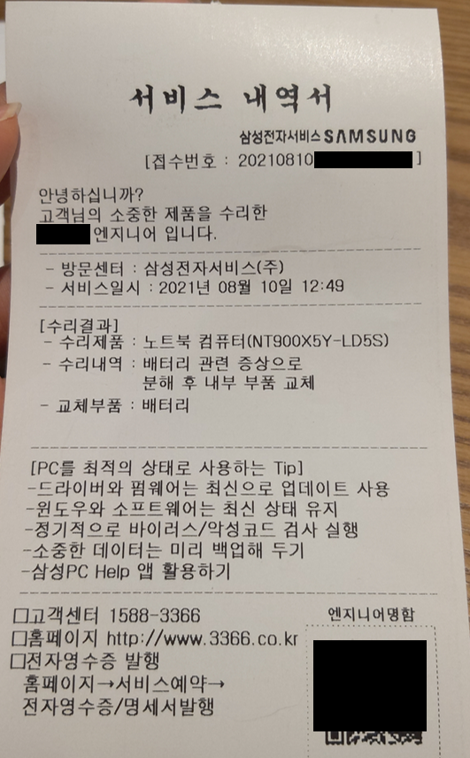 내가 너무 비싸다고 허거거거거거거거!! 놀랐더니, 배터리 값만 받고 해주신다고 하셨다. 10만원 정도 예상했는데 168,000원이라니 놀랄 수밖에!!!! (삼성 홈페이지에서는 NT900X5Y 모델의 배터리 가격을 알아볼 수 없었다.) always 모델이 배터리 용량이 커서 쫌 비싼거 같다ㅠㅠ 그래도 안 고칠 수가 없는 상황이라 교체를 요청드렸다.