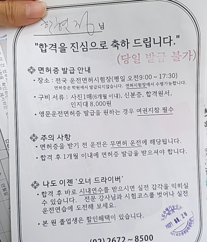 새벽에 고생하며 학원에 다닌 보람이 있어요. 이제 운전면허증만 찾으러 가면 됩니다! (언제 찾으러 갈 수 있을지 모르겠음..)