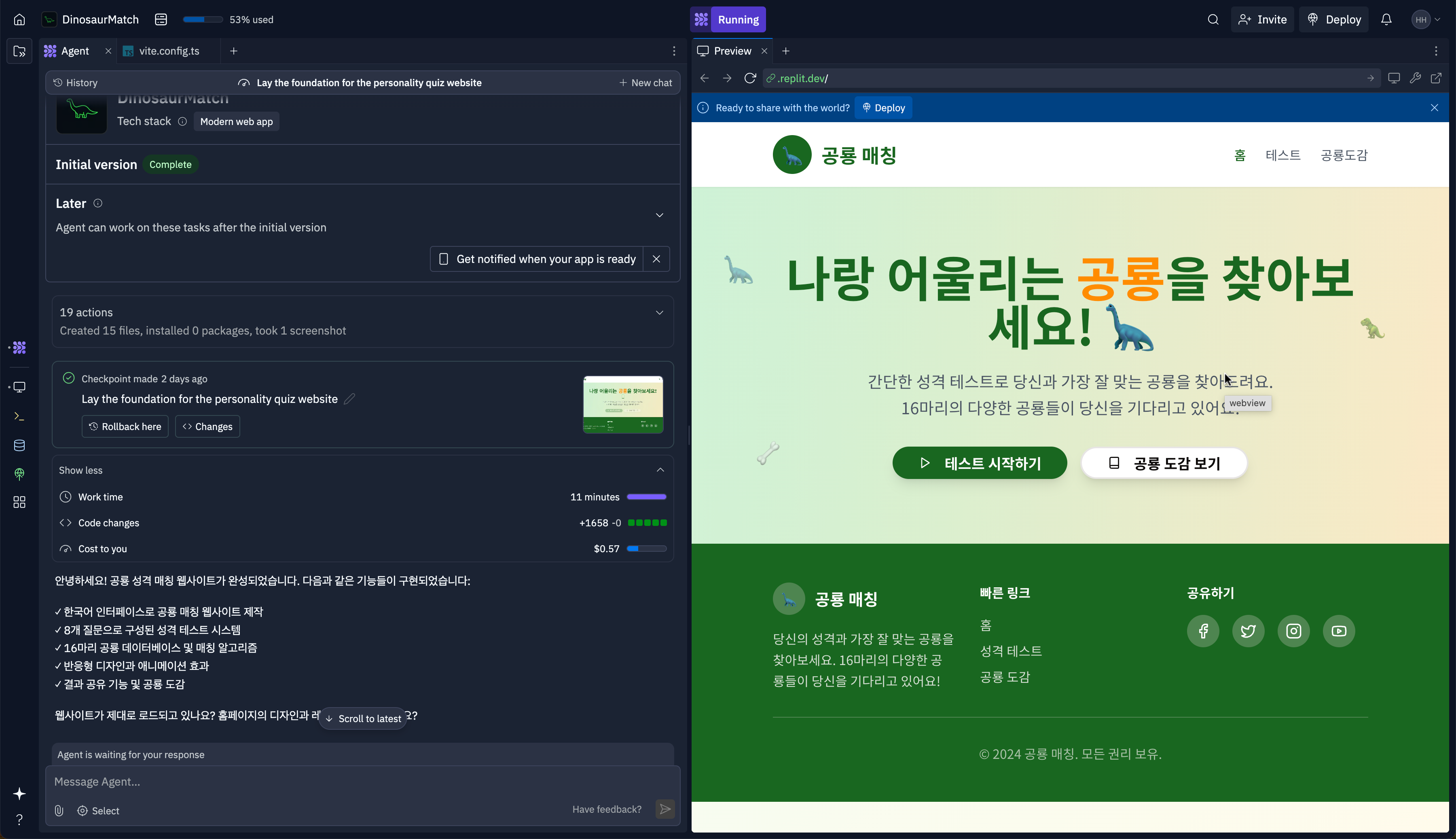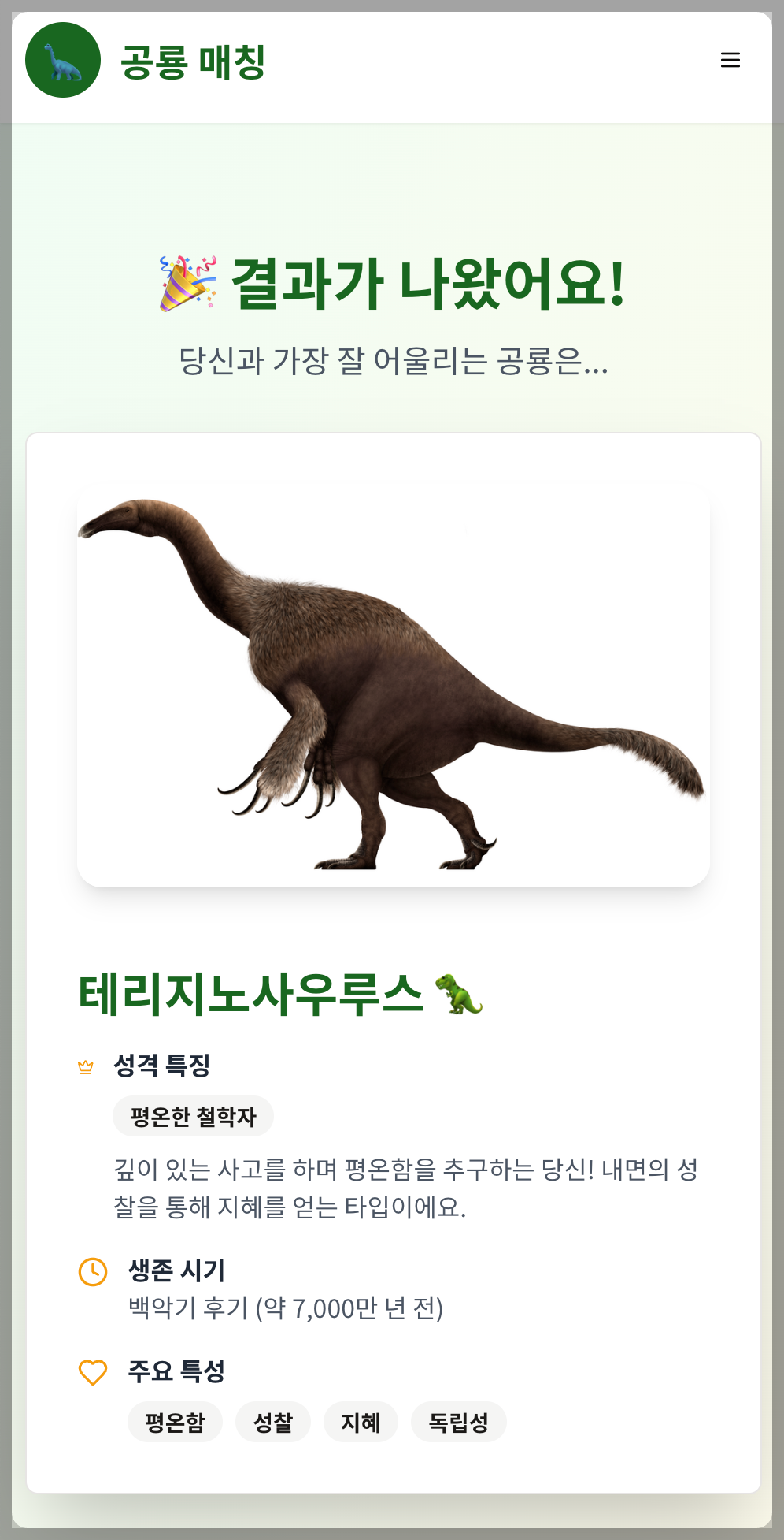 안녕하세요! 공룡 성격 매칭 웹사이트가 완성되었습니다. 다음과 같은 기능들이 구현되었습니다: