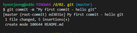 드디어 로컬 저장소에 커밋을 해줍니다. m 은 message 일걸요? 해당 커밋을 설명하는 comment를 달아주면 됩니다.