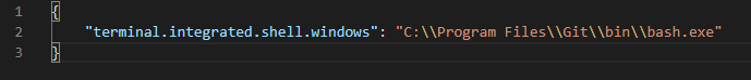 terminal.integrated.shell.windows를 C:\\Program Files\\Git\\bin\\bash.exe로 바꿔줍니다.
