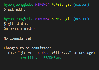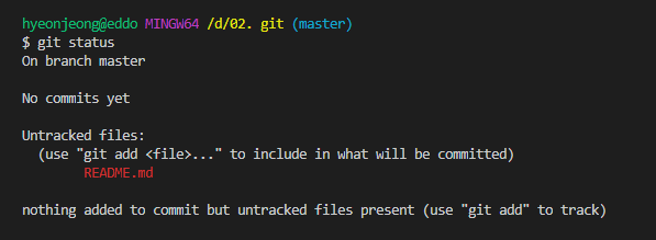 저장소의 상태를 출력해줍니다. README.md 파일을 add 하라고 나오네요 ㅎㅎ