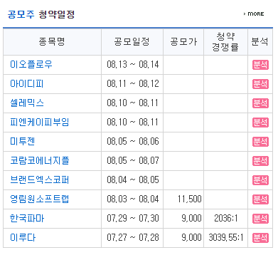 저 이미지는 글을 쓰는 8월 2일자 일정이고, 7월 29일에 저 사이트를 들어가니 한국파마가 가장 빠른 청약 일정이었다.