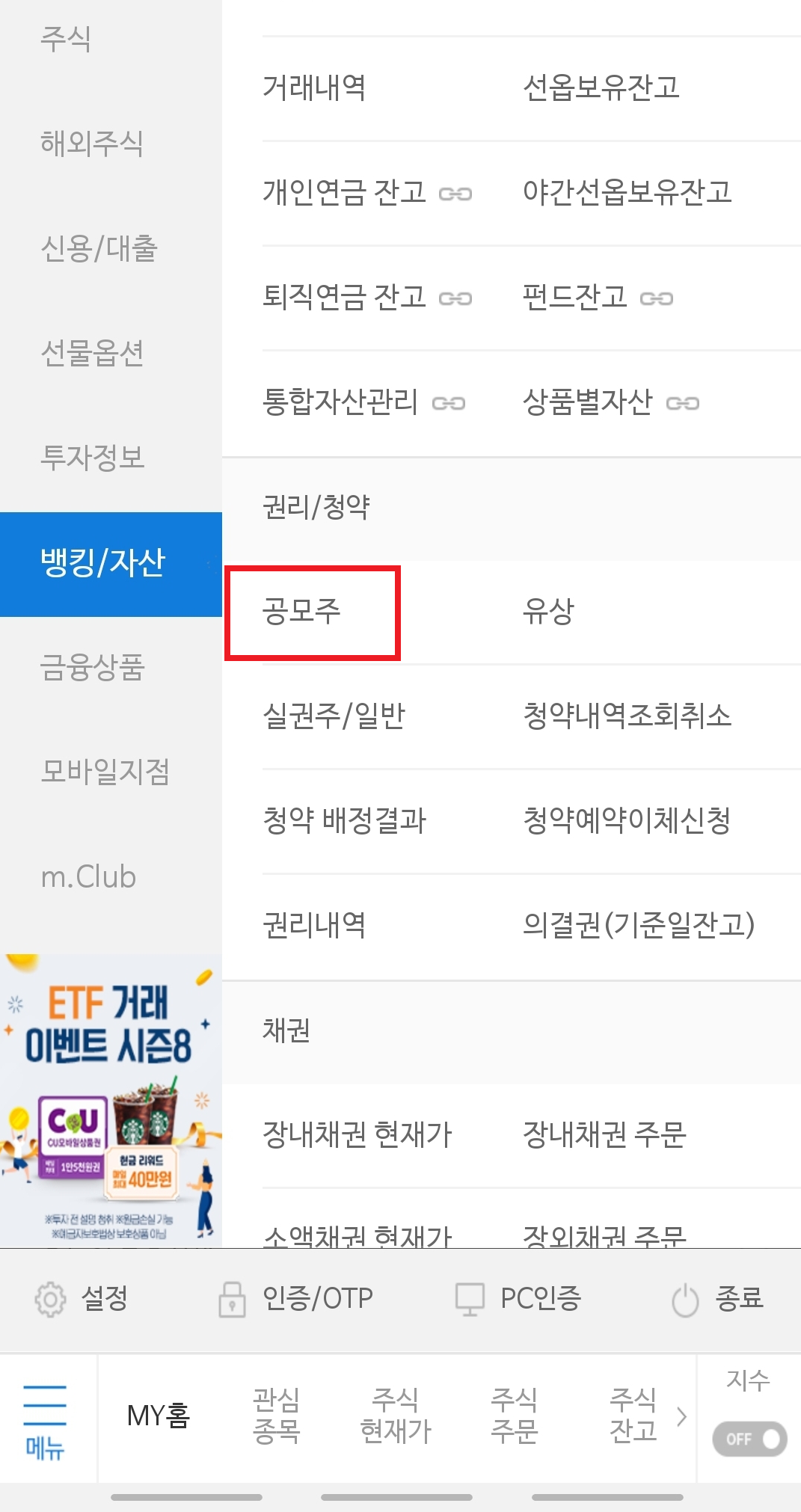 # m.stock 어플에 들어가서 아래의 공모주 를 눌러본다.