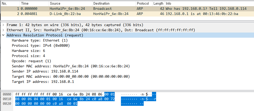 opcode를 보면 request (1) 를 하는 ARP 패킷이에요. 따라서 Target Mac 이 없는 브로드캐스팅 방식인 걸 볼 수 있어요.