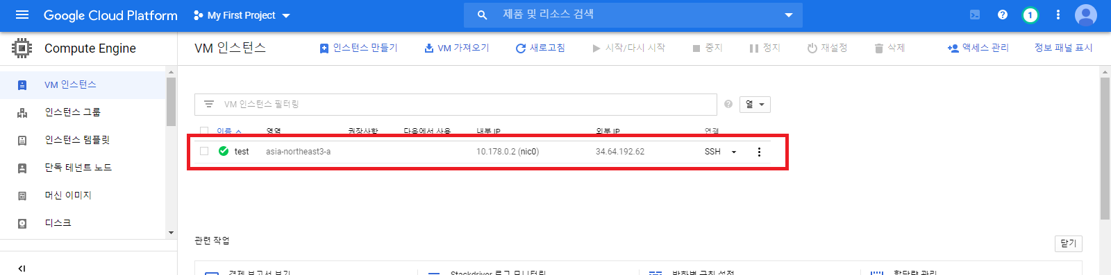 # 여기까지 하면 아래와 같이 VM 인스턴스가 생성됩니다.