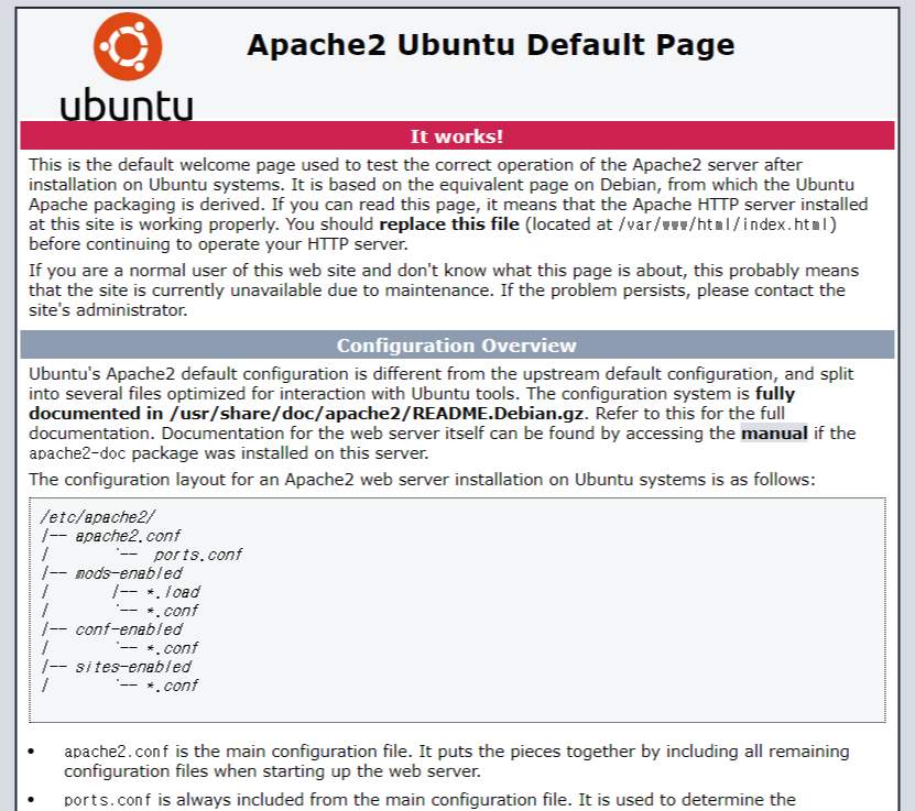 VM인스턴스의 외부 IP로 접속하면 아래와 같은 아파치 서버 페이지가 떠야 합니다. (OS에 따라 다른 화면일 수 있음)