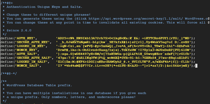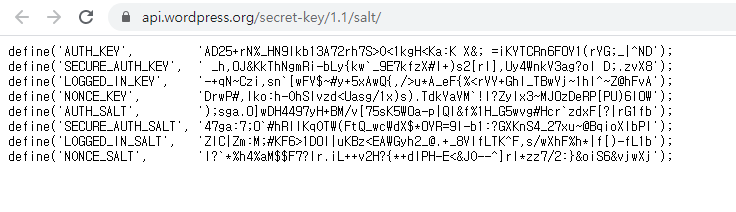 api.wordpress.org/secret-key/1.1/salt 로 접속해서 해당 내용을 복사해서 붙여줍니다.