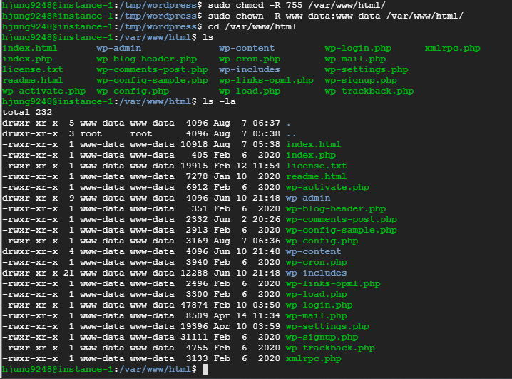 # 워드프레스 설치 파일을 /var/www/html로 옮기고 권한 설정하기