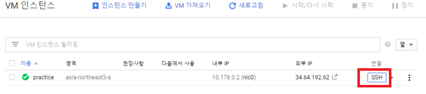 # 생성된 VM인스턴스 (클라우드환경의 컴퓨터!)에 접속합니다.