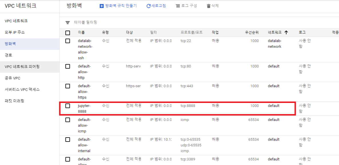 # 쥬피터 노트북을 사용하기 위하여 인스턴스에 0.0.0.0/8 (모든 IP)에 port=8888 방화벽을 허용해준다.