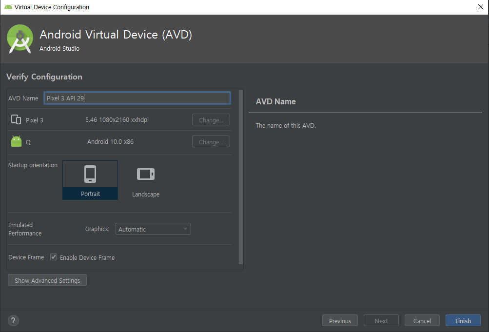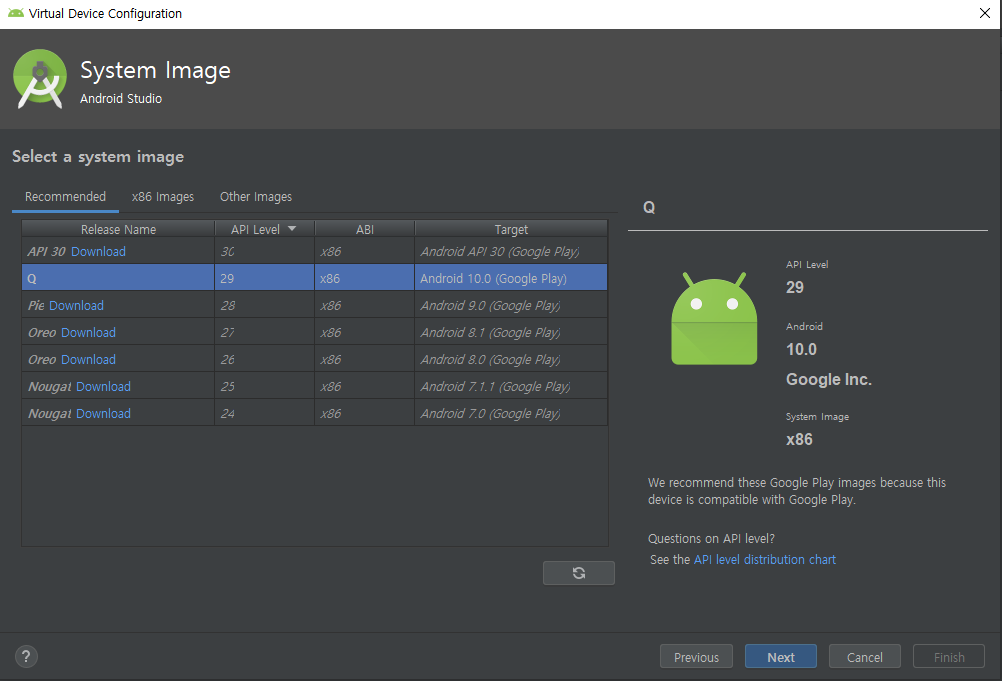 가상장치에 설치될 안드로이드 버전을 선택해줍니다. 저는 Q, 최신버전으로 깔게요.