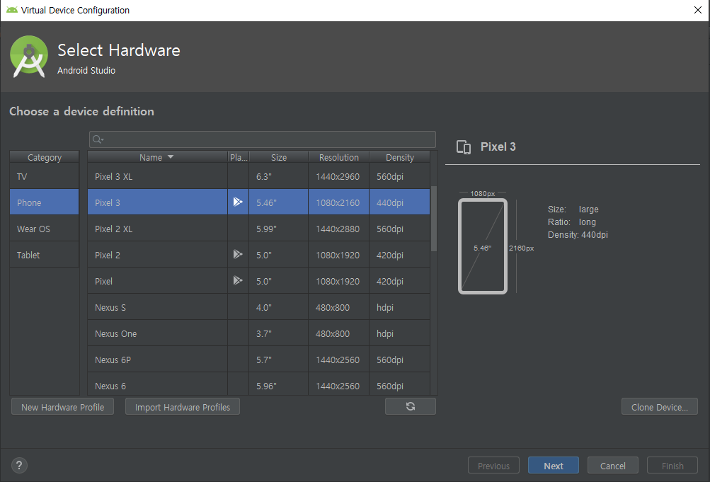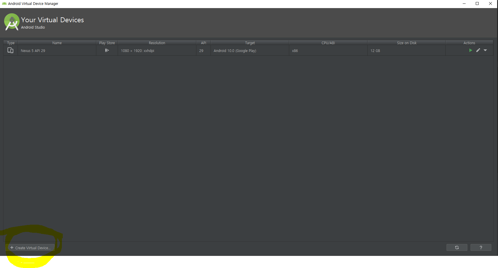 # Create Virtual Device (가상 장치 생성하기)를 누릅니다.