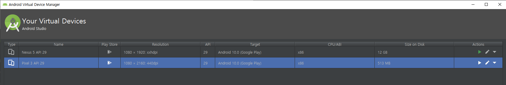 Actions 에서 재생버튼을 누르면 가상장치를 실행시켜볼 수 있습니다.