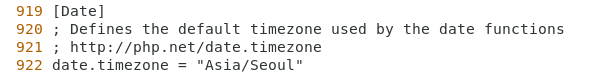 time zone 설정은 아래와 같이 진행합니다. /etc/opt/remi/php73/php.ini 파일을 열어서 약 922번째 줄에 있는 timezone을 바꿔주세요.